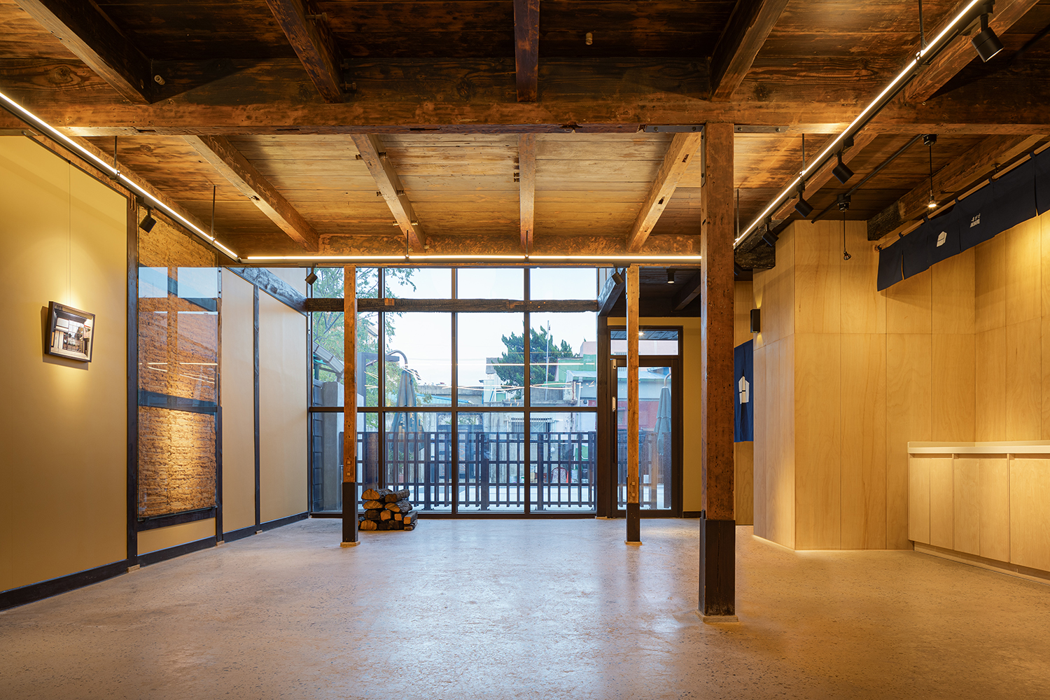 View from the first floor of HEUKLINGAK looking towards the rear park. The interior columns on the first floor were reinforced using traditional timber joinery (mortise-and-tenon extension) to preserve their original form as much as possible. The second-floor wooden floorboards were preserved to the greatest extent feasible, but the first-floor flooring, deemed to have little preservation value, was finished with concrete polishing.