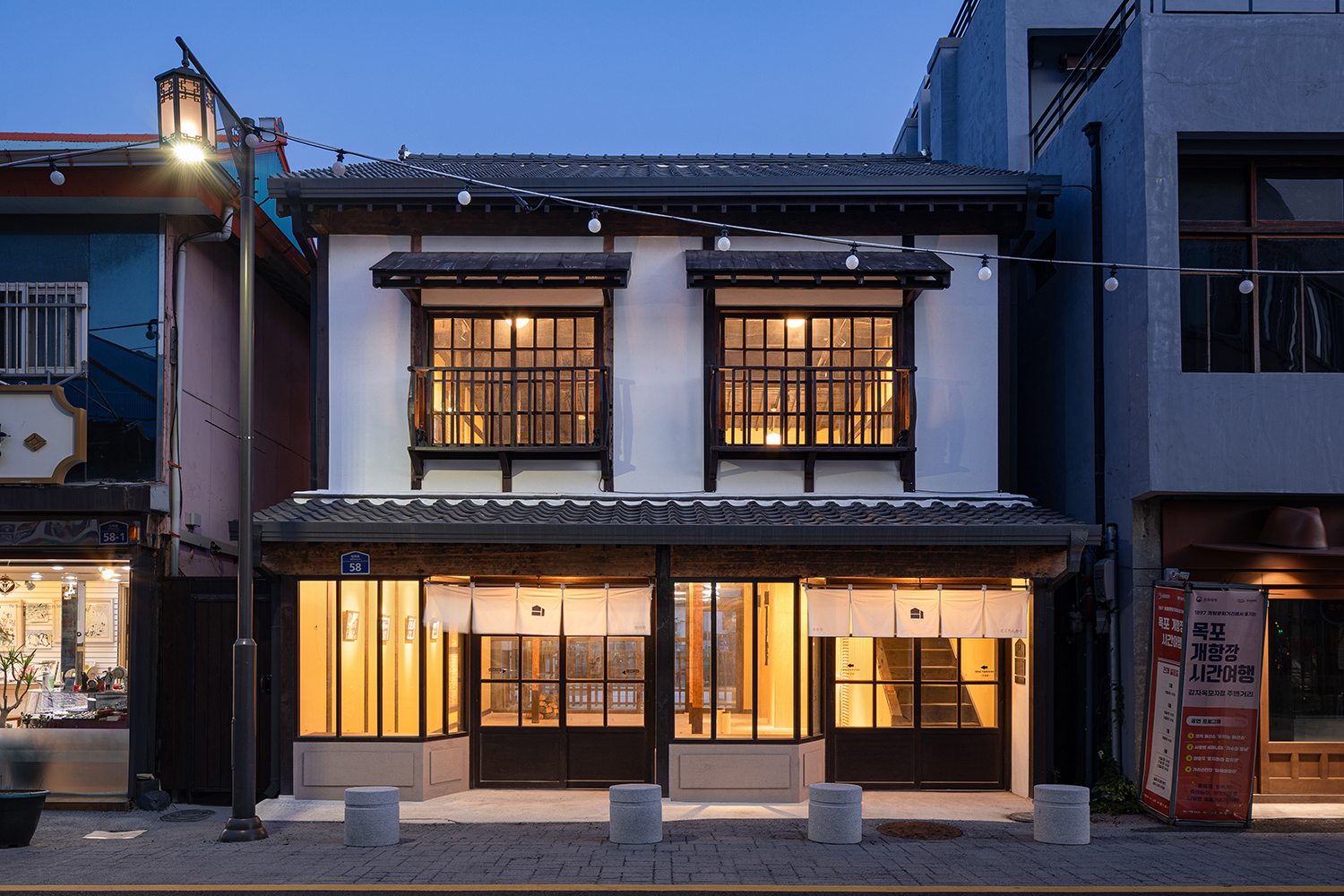 The front of HEUKLINGAK as seen from Beonhwa-ro. The restoration focused on maintaining the distinctive scale and sense of proportion characteristic of nagaya, faithfully reconstructing the roof, exterior walls, windows, bay windows (first floor), and protruding balustrades (second floor).