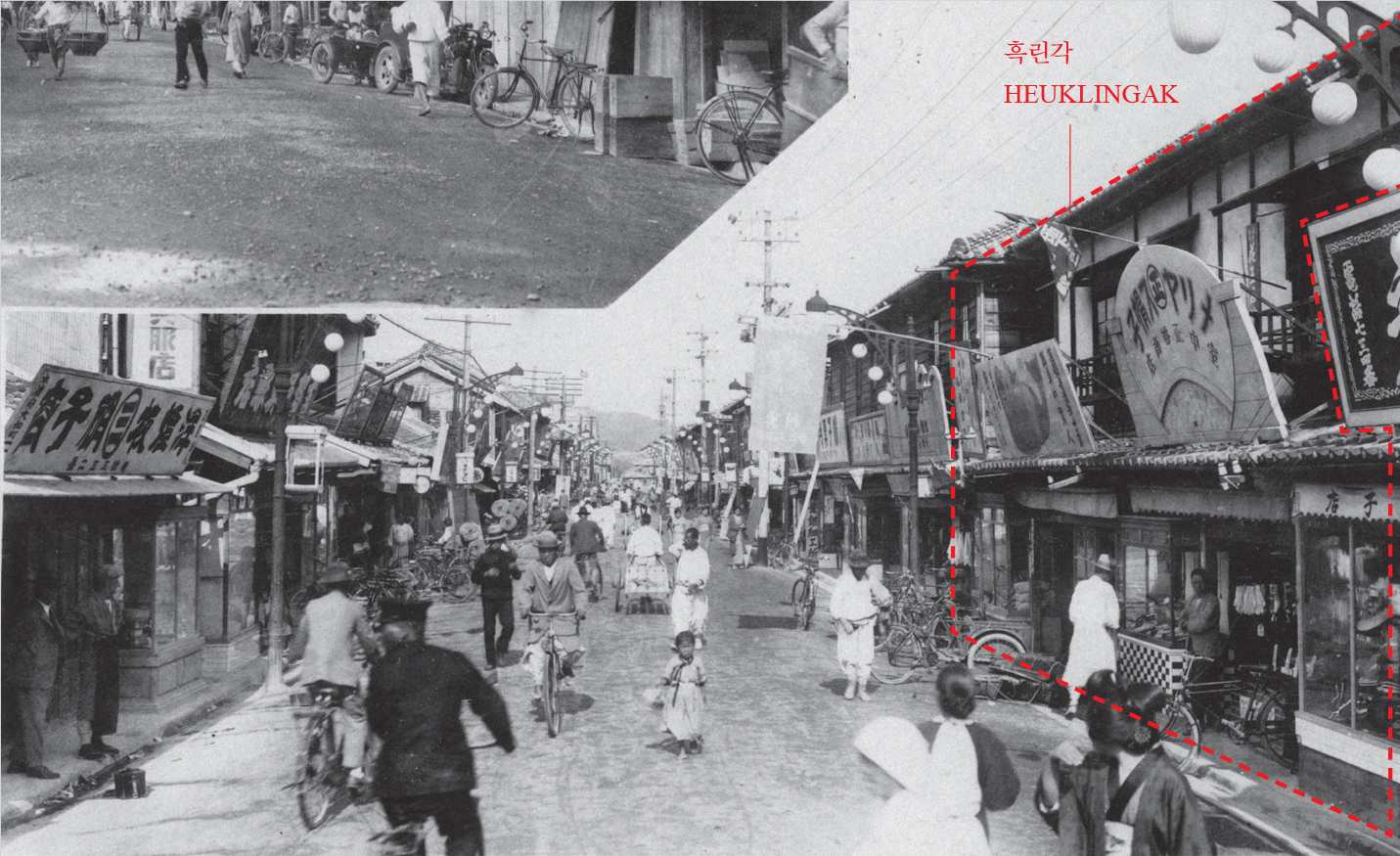 Seo Dongchun (Seo): The Beonhwa-ro in Mokpo, opened in 1897, was developed as a major commercial street for Japanese people. It is lined primarily with machiya and nagaya,¡å1 which create a continuous street frontage. The method of setting back the second floor is considered old-fashioned, even in Japan.¡å2 This was because the Great Kantō Earthquake (1923) destroyed most timber buildings following collapse or fire damage, and the reconstruction process saw Japanese signboard architecture¡å3 emerge, rather than timber or masonry structures. While timber buildings with set-back second floors are common in Kyoto, a historic city, they are almost unseen in Tokyo, for the same reason. HEUKLINGAK was a unique case in that, unlike neighbouring buildings constructed around the same time, it adhered to the traditional Japanese timber construction method for its elevations.