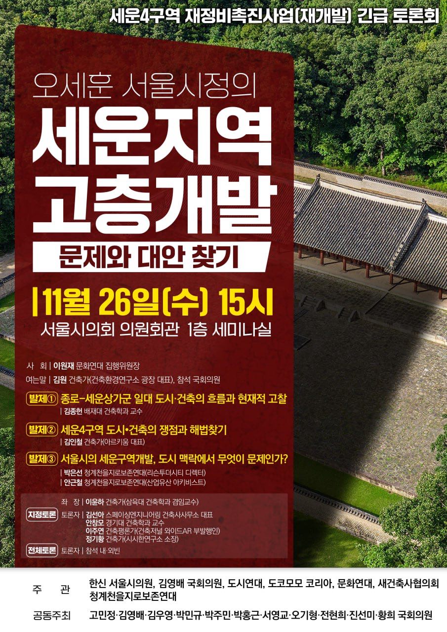 ¼¿ï½Ã¿¡¼ ¼¼¿îÀçÁ¤ºñÃËÁøÁö±¸ ¹× 4±¸¿ª ÀçÁ¤ºñÃËÁø°èȹ °áÁ¤À» ÃÖ±Ù °í½ÃÇÏ¸é¼ ¼¼¿î4±¸¿ªÀÇ °Ç¹° ÃÖ°í ³ôÀ̰¡ Á¾·Î ÂÊÀº 55£í¿¡¼ 98.7m, û°èõ ÂÊÀº 71.9£í¿¡¼ 141.9£í·Î º¯°æµÆ´Ù. ÀÌ¿¡ À¯³×½ºÄÚ ¼¼°èÀ¯»êÀÎ Á¾¹¦ÀÇ °æ°ü Áú¼¸¦ ÈѼÕÇÒ ¼ö ÀÖ´Ù´Â ¿ì·Á°¡ ³ô¾ÆÁö´Â °¡¿îµ¥, ±¹È¸ÀÇ¿øÀ» ºñ·ÔÇØ °ÇÃà Àü¹®°¡¿Í ½Ã¹Î´Üü°¡ ÇÑÀÚ¸®¿¡ ¸ð¿© ³íÀÇÇÏ´Â ±ä±Þ Åä·Ðȸ°¡ ¼¿ï½ÃÀÇȸ ÀÇ¿øÈ¸°ü¿¡¼ ¿¸°´Ù. º» Çà»çÀÇ Á¦¸ñÀº ¡®¿À¼¼ÈÆ ¼¿ï½ÃÁ¤ÀÇ ¼¼¿îÁö¿ª °íÃþ°³¹ß ¹®Á¦¿Í ´ë¾È ã±â¡¯´Ù. °í¹ÎÁ¤, ±è¿µ¹è, Áø¼±¹Ì, ¹ÚÁֹΠµî ´õºÒ¾î¹ÎÁÖ´ç ±¹È¸ÀÇ¿ø 10¸íÀÌ ÁÖÃÖÇÏ°í µµÄÚ¸ð¸ð ÄÚ¸®¾Æ, û°èõÀ»Áö·Îº¸Á¸¿¬´ë, »õ°ÇÃà»çÇùÀÇȸ µî 5°³ °ÇÃࡤ½Ã¹Î´Üü, ±è¿µ¹è ±¹È¸ÀÇ¿ø½ÇÀÇ ÁÖ°ü ¾Æ·¡ ¿¸®´Â À̹ø Çà»ç´Â ¹ßÁ¦, ÁöÁ¤ Åä·Ð, Àüü Åä·Ð ¼øÀ¸·Î ÁøÇàµÈ´Ù.