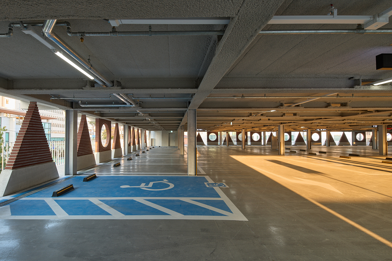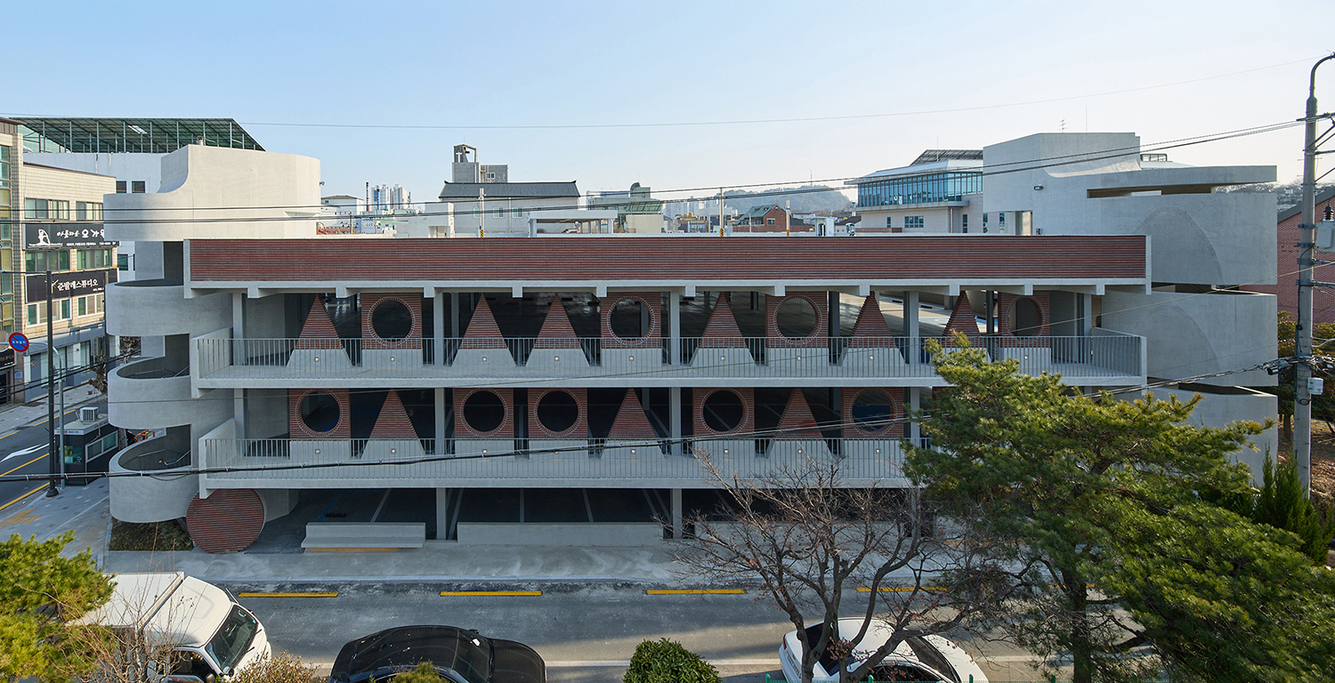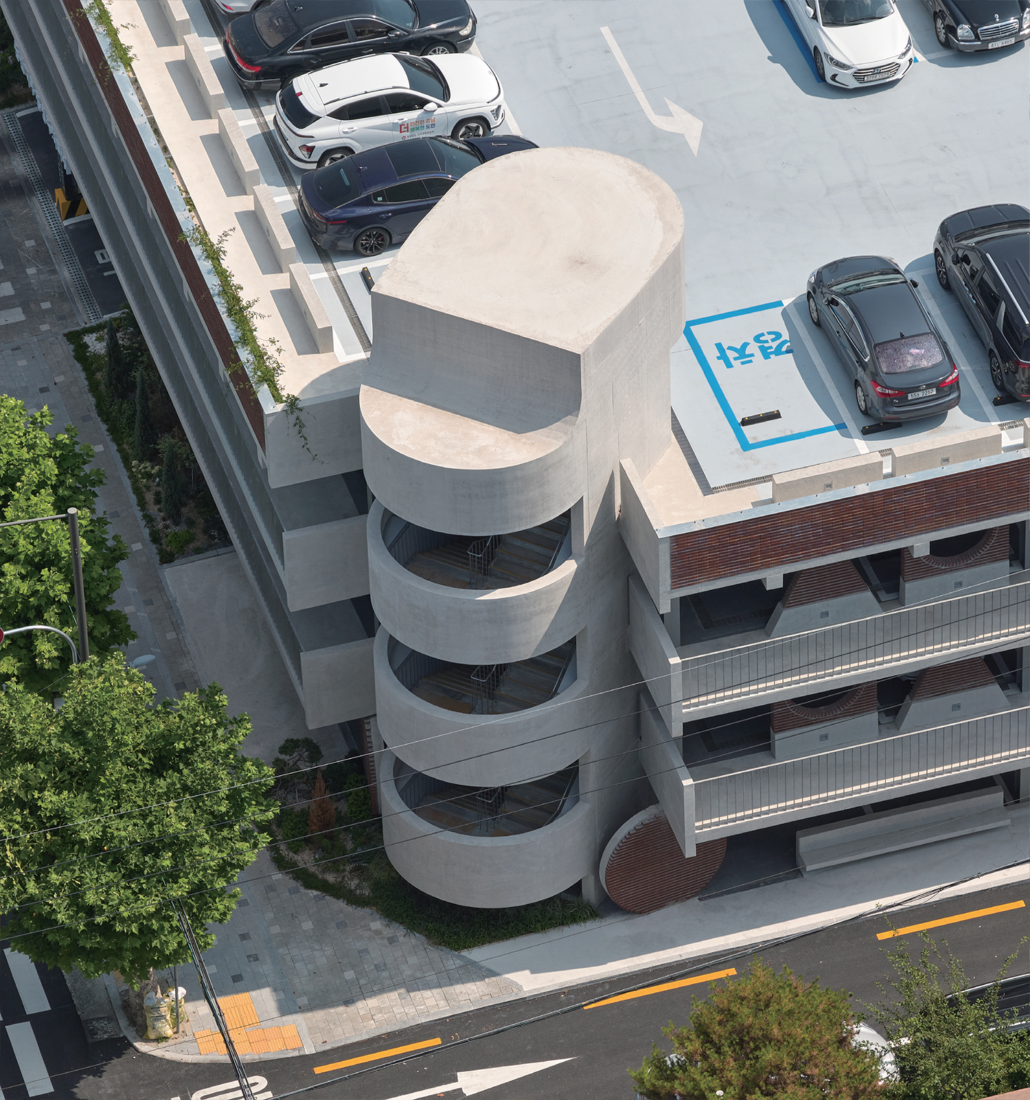 ÁÖÂ÷Àå ÀԸ鿡 Èï¹Ì·Ó°í ´Ù¾çÇÑ À̹ÌÁö¸¦ ´ã¾Æ µµ½Ã¿¡ Ȱ±âÂù Ç¥Á¤À» ¼±»çÇϱâ À§ÇØ, ÁÖÀç·áÀÎ ³ëÃâÄÜÅ©¸®Æ®¿Í º®µ¹ÀÇ ¹°¼ºÀ» Ȱ¿ëÇÑ ±âÇÏÇÐÀû ¿ä¼Ò¸¦ µµÀÔÇß´Ù. ÀԸ鿡 »ç¿ëµÈ º®µ¹Àº ÁÖº¯ÀÇ ¿À·¡µÈ »ó°¡, ´Ù°¡±¸ÁÖÅÃ, °ø°ø°Ç¹°ÀÇ º®µ¹ ¿ÜÀå°ú ¾î¿ì·¯Áö¸ç »õ ÁÖÂ÷ÀåÀÇ ¿Ü°üÀÌ ³¸¼³Áö ¾Ê°Ô ´À²¸Áöµµ·Ï Çß´Ù. °¢ Ãþ ¿Ü°û¿¡ ¼³Ä¡ÇÑ ¿ÜºÎ º¸ÇàÅë·Î´Â ÁÖº¯°ú ÁÖÂ÷Àå »çÀÌÀÇ ¸Å°³ °ø°£(¹öÆÛÁ¸)À» Çü¼ºÇϸç, °Ç¹°¿¡ ÀÔü°¨À» ºÎ¿©Çϰí ÁÖÂ÷Àå ÀÌ¿ëÀڵ鿡°Ô ÄèÀûÇÑ °³¹æ°¨À» ¼±»çÇÑ´Ù. ÁÖÂ÷ °ø°£°ú º¸ÇàÅë·Î¸¦ ±¸ºÐÇÏ´Â ±âÇÏÇÐÀû ÆÄ»çµå´Â Àǹ«ÀûÀ¸·Î ¼³Ä¡ÇØ¾ß ÇÏ´Â Ãæµ¹¹æÁöÅÎÀ» Ȱ¿ëÇÑ µðÀÚÀÎÀ¸·Î, ÁÖº¯°ú Á¶È¸¦ ÀÌ·ç¸ç µµ½Ã°æ°ü¿¡ Ȱ±â¸¦ ÁÖµµ·Ï ¼³°èµÆ´Ù. 1Ãþ¿¡´Â ¸¶À» Ä«Æä¿Í ÀÚÀü°Å ÁÖÂ÷ÀåÀ» Á¶¼ºÇØ ÁֹεéÀÌ Àϻ󿡼 ÀÚÁÖ Ã£´Â ÁÖÂ÷ÀåÀÌ µÇ±æ ¹Ù¶ú´Ù.