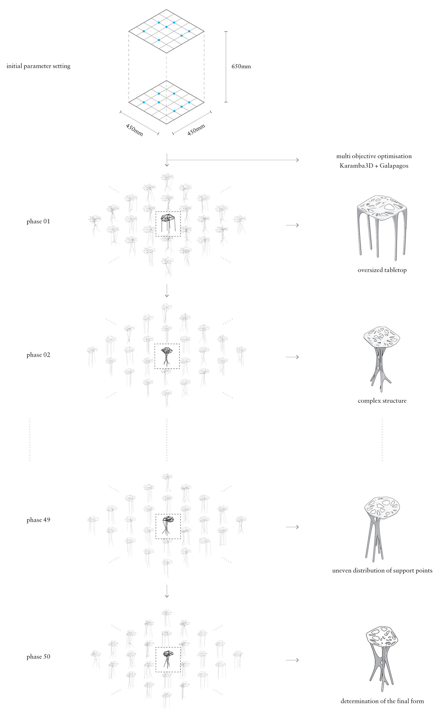 ±èÀç°æ: ¿¡Àϸ®¾ð Å×À̺íÀº 2015³â ÅØÅä´ÐÀ» ÁÖÁ¦·Î ³ª¹«¿Í ÄÜÅ©¸®Æ®¸¦ ¿¬±¸ÇÒ ¶§ ±×Áß ÄÜÅ©¸®Æ®¸¦ °¡Áö°í ÇÑ ÀÛ¾÷ÀÌ´Ù. ³ª¹«´Â ÀÚüÀûÀ¸·Î °¡°øÀÌ °¡´ÉÇÏ´Ù º¸´Ï ÁøÇà ¼Óµµ°¡ ±²ÀåÈ÷ »¡¶ú´Âµ¥ ¹ÝÇØ, ÄÜÅ©¸®Æ®´Â ¸¸µå´Â °úÁ¤ÀÌ ½±Áö ¾Ê¾Ò´Ù. ÀÌ Å×À̺íÀ» Çϳª ¸¸µå´Â µ¥ 1³âÀÌ °É·È´Ù. ±¸Á¶ ÃÖÀûÈ ÇÁ·Î±×·¥À» »ç¿ëÇØ Àΰ£Àº ¿ÏÀüÈ÷ ¹ÌÀûÀÎ °Í¿¡¸¸ °³ÀÔÇÏ´Â ¼³°è ¹æ½ÄÀ» ½ÃÇèÇß´Ù. ±×·¡½ºÈ£ÆÛÀÇ °¥¶óÆÄ°í½º, Ä«¶÷¹Ù(Karamba3D)¸¦ Ȱ¿ëÇØ¼ ³ôÀÌ¿Í À§¾Æ·¡ÀÇ ÁöÁ¡ °³¼ö¸¸À» º¯¼ö·Î ÁÖ°í ÇüŸ¦ »ý¼ºÇß´Ù. ±×·¯¸é °¥¶óÆÄ°í½º ÇÁ·Î±×·¥ÀÌ ¼öµµ ¾øÀÌ ¸¹Àº ÇüŸ¦ ¸¸µé°í, Ä«¶÷¹Ù°¡ ÀÌ¿¡ ´ëÇÑ ±¸Á¶ ÇØ¼®À» ÇØ¼ ±×Áß °¡Àå ¾ÈÁ¤ÀûÀÎ ÇüÅ ¸î °¡Áö¸¦ ÃßÃµÇØÁØ´Ù. º¯¼ö¸¦ Ãß°¡Çϱ⵵ Çϸç ÀÌ °úÁ¤À» ¹Ýº¹Çؼ ÃÖÁ¾ ÇüŸ¦ ¼±ÅÃÇß´Ù. ±×·¸°Ô ¼±ÅÃµÈ ÇüŸ¦ ±¸ÇöÇϱâ À§ÇØ 3D ÇÁ¸°ÆÃÀ» °í·ÁÇßÀ¸³ª, 3D ÇÁ¸°ÆÃÀ» ÇÑ ÄÜÅ©¸®Æ®´Â ±¸Á¶Ã¼°¡ µÉ ¼ö ¾ø¾ú´Ù. ±âº»ÀûÀ¸·Î 3D ÇÁ¸°ÆÃÀº ÀûÃþ ¹æ½ÄÀ̱⠶§¹®¿¡ ¼öÆò ÇÏÁß°ú ÀÎÀå¿¡ ¾ÆÁÖ Ãë¾àÇÏ´Ù. ÀÌ Á¤µµ ±Ô¸ðÀÇ Å×À̺íÀº ±×·¸°Ô ¸¸µé ¼ö¾ß ÀÖ°ÚÁö¸¸ ³ª´Â Àå±âÀûÀ¸·Î °Ç¹° ½ºÄÉÀÏ¿¡¼ Ȱ¿ëÇÒ ¼ö ÀÖ´Â ÁøÁ¤ÇÑ ±¸Á¶Ã¼¸¦ ¸¸µé ¼ö ÀÖ´Â ½Ã°ø ÇÁ·Î¼¼½º¸¦ ½ÇÇèÇϰíÀÚ Çß´Ù. ±×·¡¼ ¹Ý´ë·Î 3D ÇÁ¸°ÆÃÀ¸·Î °ÅǪÁýÀ» ¸¸µé¾î ±× ¾È¿¡ ÄÜÅ©¸®Æ®¸¦ Ÿ¼³ÇÏ°í ¾ç»ýÇÏ´Â ¹æ½ÄÀ» ÅÃÇß´Ù. ´ç½Ã¿¡´Â 3D ÇÁ¸°ÆÃ ¸ôµå°¡ 10³â Á¤µµ Áö³ª¸é Àú·ÅÇØÁú °Å¶ó°í »ý°¢Çß´Ù. 3D ÇÁ¸°ÆÃ °ÅǪÁýÀº ½Ç¸®Ä«·Î ¸¸µé¾î ¾ç»ý ÈÄ ¸ÁÄ¡·Î ±ú¼ Á¦°ÅÇß´Ù.