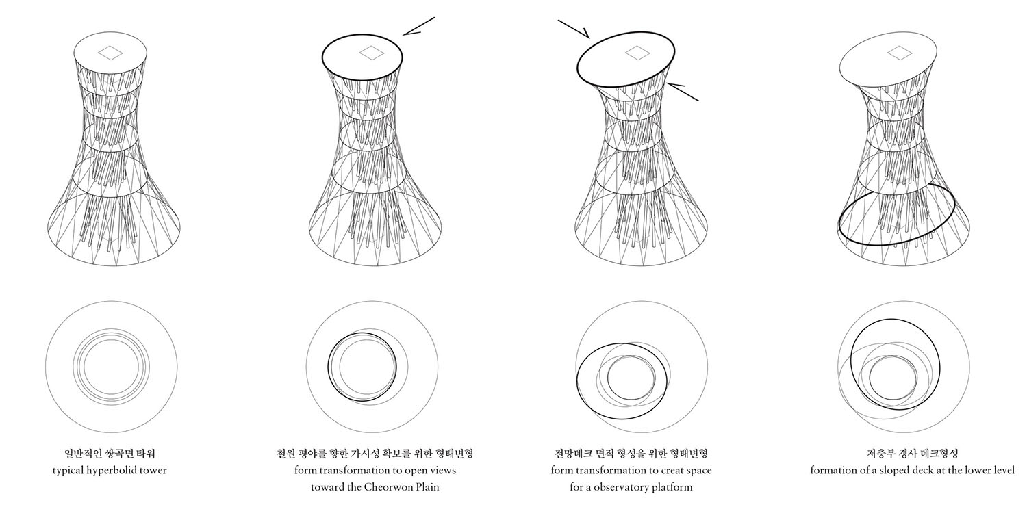 ±èÀç°æ: Àü¸Á´ë µðÀÚÀο¡¼ °¡Àå Áß¿äÇÑ ¿ä¼Ò´Â »ó¡¼º, °ð ÁÖº¯ ȯ°æ°ú Á¶È¸¦ ÀÌ·ç´Â ¾Æ¸§´Ù¿î ÇüÅÂÀÇ Ã¢ÃâÀÌ´Ù. ÀÌ·¯ÇÑ ÇüŸ¦ ±¸ÇöÇÏ´Â ¹æ¹ý¿¡´Â Æû ¸ÞÀÌÅ·(form-making)°ú Æû ÆÄÀεù(form-finding)ÀÌ ÀÖ´Ù. ÀüÀÚ´Â ±¸Á¶Àû ³í¸®º¸´Ù´Â Á¶Çü¼ºÀ» ¿ì¼±Çϸç, ¹Ý´ë·Î ÈÄÀÚ´Â ±¸Á¶Àû ¿ø¸® ¼Ó¿¡¼ ÇüŸ¦ ¹ß°ßÇÏ°í ´Ùµë´Â °úÁ¤À¸·Î, °¡¿ìµðÀÇ Çö¼ö¼± ¸ðÇüÀÌ ´ëÇ¥Àû »ç·Ê¶ó ÇÒ ¼ö ÀÖ´Ù. ÇÑź° Àü¸Á´ë´Â ÀÌ µÎ Á¢±Ù¹ýÀÇ Áß°£ ÁöÁ¡¿¡ ³õ¿© ÀÖ´Ù. ÄÉÀÌºí ½Ö°î¸é ±¸Á¶¸¦ ¼³Á¤ÇÏ¿© ±âº»ÀûÀÎ ÇüŸ¦ Æû ÆÄÀεù ¹æ½ÄÀ¸·Î µµÃâÇϰí, ÀÌÈÄ Á¶ÇüÀû, ±â´ÉÀû ¿ä±¸¿¡ µû¶ó À̸¦ º¯ÇüÇÏ´Â °úÁ¤¿¡¼ Æû ¸ÞÀÌÅ· ¹æ½ÄÀ» º´ÇàÇß´Ù.