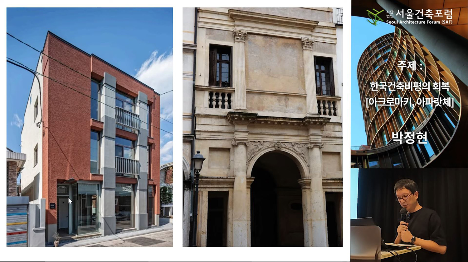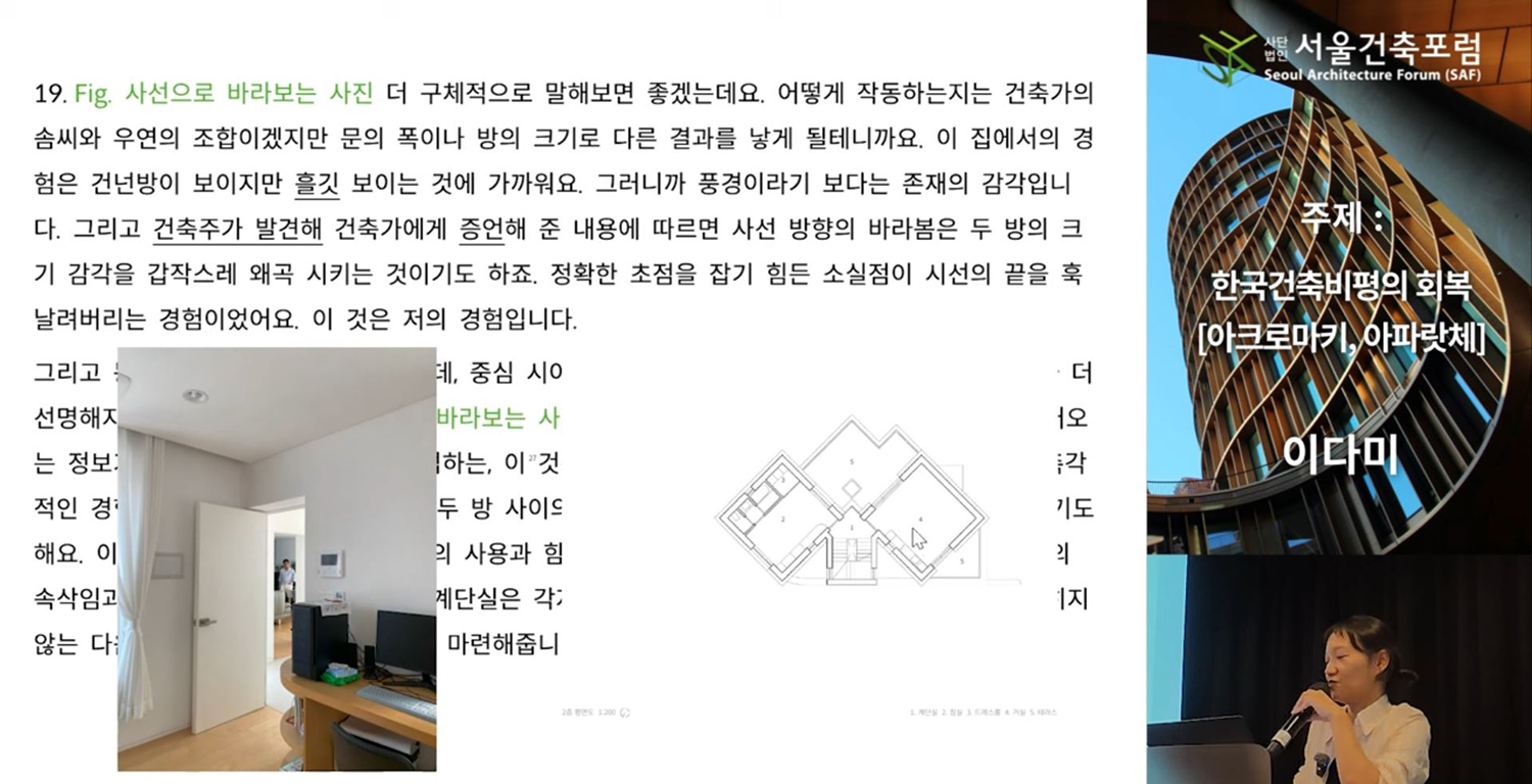 ¾ÆÆÄ¶ùüÀÇ ÀÛ¾÷¿¡¼ ÁÖ¿äÇÏ°Ô ÁÖ¸ñÇÑ °ÍÀº ÆÄ»çµå´Ù. ±×´Â Â÷¸®¼÷¼Ò, ÆÄÁÖ¶ã(2017)¿¡¼ ¿¬»óµÇ´Â ¾Æµ¹ÇÁ ·Î½ºÀÇ ÁÖÅà ÀÛ¾÷µéÀ» °æÀ¯ÇØ ¿¬Èñ°ø´Ü(2018), È«ÀºÁÖÅÃ(2019)¿¡¼ º¸ÀÌ´Â ¡®¾ó±¼¡¯·Î ³ª¾Æ°£´Ù. ±×·¯¸é¼ ÀÌ·¯ÇÑ ¾ó±¼ÀÌ °æÇèÀûÀ¸·Î´Â ÀνĵÇÁö ¾Ê°í, °ÇÃà »çÁøÀ̳ª µµ¸é¿¡¼ ÀÐÈù´Ù´Â Á¡¿¡¼ ¡®°ü³äÀû ¾ó±¼¡¯ÀÓÀ» ÁöÀûÇϸç Â÷¸®Ä«Æä(2022, ¡¸SPACE(°ø°£)¡¹ 663È£ Âü°í)·Î °¡´ê´Â´Ù. Â÷¸®Ä«Æä¿¡¼´Â ƯÈ÷ ¶Ù¾î³ ¼º´ÉÀ» °¡Áø ÆÄ»çµå¸¦ ¤¾ú°í, ÀÌ¿Í ¿¬°üÇØ ºø¹° ¼±È¨ÅëÀÌ Ã¶°ñ ±âµÕ µÎ °³¸¶´Ù ¹Ýº¹ÀûÀ¸·Î Çϳª¾¿ ¹èÄ¡µÇ¾î ÆÄ»çµå¸¦ ÈξÀ ´Ùä·Ó°Ô ¸¸µç´Ù´Â Á¡À» ¾ð±ÞÇß´Ù. ¹ÚÁ¤ÇöÀº ÀÌ·¯ÇÑ °ÇÃàÀû ÇØ¼® °¡¿îµ¥ ±âÁ¸ µµ½Ã¸¦ ³»¹ö·ÁµÐ ä »õ·Î¿î µµ½Ã¸¦ ¸¸µå´Â °ÍÀÌ Çѱ¹ÀÇ °ÅÀÇ À¯ÀÏÇÑ µµ½Ã°èȹÀ̶ó´Â Á¡, ÀÌ °èȹÀÇ À̵¥¿Ã·Î±â´Â ½Å½Ã°¡Áö¿¡ ±× ½Ã´ë¸¶´Ù À¯ÇàÇÏ´Â ÇÁ·Î±×·¥À» »Ñ·Á³õ´Â °ÍÀ̶ó´Â Á¡ µî µµ½Ã¿Í °ü·ÃÇÑ °Å½ÃÀû È帧À» ¾ð±ÞÇß´Ù. ¶ÇÇÑ Àß Â¥ÀÎ Æò¸éÀ» Ãß±¸ÇÏ´Â ÀüÅëÀû È帧ÀÌ ÀÖ°í À̰ÍÀÌ °íÀüÀû ¶Ç´Â º¸ÀÚ¸£ÀûÀ̶ó°í ºÒ·È´Ù´Â Á¡, Ç¥¸é°ú ºñÆø, »À´ë¸¦ µÑ·¯½Ñ ¸»ÀÌ µÚ¾ûŲ ÅØÅä´Ð ³íÀïÀÌ ¶°¿À¸¥ Á¡, ÂüÁ¶´Â 4.3 ±×·ì ¶ÇÇÑ ÇàÇØ¿Ô°í ºñ±³Àû ÃÖ±Ù ¡®¹ö³»Å§·¯¡¯°¡ ÀÌ ÂüÁ¶ ¸ñ·Ï¿¡ Ãß°¡µÈ Á¡ µî °ÇÃàÀû ³íÀÇ¿¡¼ À§ÀÇ ÀÛ¾÷µéÀ» ¾î´À ÁÂÇ¥¿¡ À§Ä¡½Ãų ¼ö ÀÖÀ»Áö ÈùÆ®¸¦ Á¦°øÇß´Ù. ±×·¸Áö¸¸ À̰ÍÀ» ¼¼¼¼ÇÏ°Ô °³º°ÀÇ °ÇÃà ÀÛ¾÷°ú ¿¬°áÇØ ¼³¸íÇÏ´Â °ÍÀº ºÒÇÊ¿äÇØ º¸ÀδÙ. ¿Ö³ÄÇÏ¸é ¹ÚÁ¤ÇöÀÌ ¡°ÇÁ·ÎÁ§Æ® ¼³¸íÀ» ¿ä¾àÇϰųª, º¸°ÇØ Àç¼¼úÇϰí, ¼±·Ê¿Í °³³äÀ» ã¾Æº» µÚ ±âÁ¸ÀÇ °Í°ú °ßÁÖ°í, ¹æ¹®ÇßÀ» ¶§ÀÇ ÀλóÀ» Àü´ÞÇϰí, °ÇÃà°¡°¡ ¾ð±ÞÇÏÁö ¾ÊÀº °ÍÀ» ¹ß°ßÇϰí, ÃÖ±Ù¿¡ À¯ÇàÇÏ´Â Àι®ÇÐÀû ´ã·ÐÀ¸·Î °ÇÃàÀ» Æ÷¼·ÇÏ·Á°í ÇÏ´Â ½Ãµµ¸¸À¸·Î ÃæºÐÇѰ¡¡±¸¦ Áú¹®Çϸç ÀÚ½ÅÀÌ ¾Õ¼ ÇÑ °ÍÀÌ ºñÆòÀÌ ¾Æ´Ï¶ó°í ÀÚÀÎÇ߱⠶§¹®ÀÌ´Ù. ±×°¡ À̹ø ¹ßÇ¥¿¡¼ ¹«°Ô¸¦ µÐ ³íÀÇ´Â ºñÆòÀÇ ³»¿ëº¸´Ù´Â ºñÆòÀÇ ºÒ°¡´É¼º¿¡ ´ëÇÑ ÀÚÆòÀ̾ú´Ù. ±×´Â µµ½Ã ¼Ó °ÇÃàÀÇ °³º°¼ºÀº °ø°ø¼º, ÀÚº» ÃàÀû ³í¸® µîÀÇ ¾Ð¹ÚÀ» ¹ÞÀ¸¸ç ³ì¾Æ ¾ø¾îÁö°í, µµ½Ã¸¦ ¹þ¾î³ »çÀ¯¿ø, ¸Þµ¢°ñ Á¤¿ø µîÀº »ýȰ°ú Á¤Ä¡¿¡¼ ºÐ¸®µÅ À¯»ç ¿¹¼úó·³ ¼ÒºñµÇ°í ÀÖ´Ù°í ÁöÀûÇß´Ù. ÀÌ¿Í °°ÀÌ °ÇÃàÀÇ ÀÚÀ²¼ºÀÌ ±ØÈ÷ Á¦ÇÑµÈ »óȲ¿¡¼´Â ºñÆò ¶ÇÇÑ º»ÁúÀûÀ¸·Î Å« Â÷À̰¡ ¾ø´Â °Ç¹°ÀÇ Æ¯Â¡À» ¾ïÁö·Î ã¾Æ³»´Â ¿ªÇÒ¸¸ ÇÒ ¼ö ÀÖÀ» »ÓÀÌ´Ù. °á·ÐÀûÀ¸·Î ¹ÚÁ¤ÇöÀº ¡°°ÇÃàÀÇ ÇѰ踦 È®Á¤Çϰí, °ÇÃàÀ» ¼ÒºñÇϰí, ºñÆòÀÇ ¹üÀ§¸¦ Á¦ÇÑÇÏ´Â ÀÌ ÈûÀ» °¡·ÎÁö¸£Áö ¾Ê°í¼ °ÇÃà ºñÆòÀÌ ÀÖ´Ù°í »ý°¢ÇÏ´Â °ÍÀº °ÇÃà ºñÆòÀÌ Á¸ÀçÇÑ´Ù´Â ¾Ë¸®¹ÙÀÌÀÏ »Ó¡±À̶ó°í ÁÖÀåÇß´Ù.